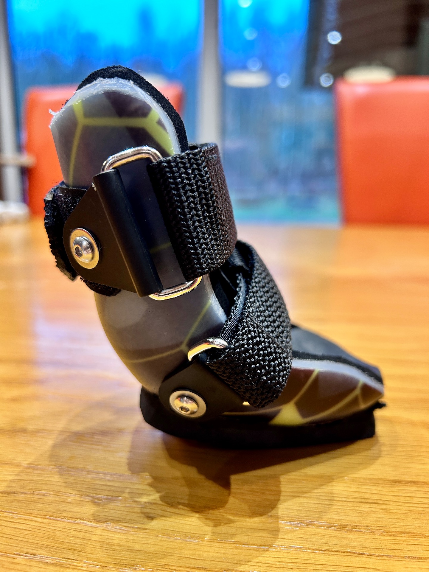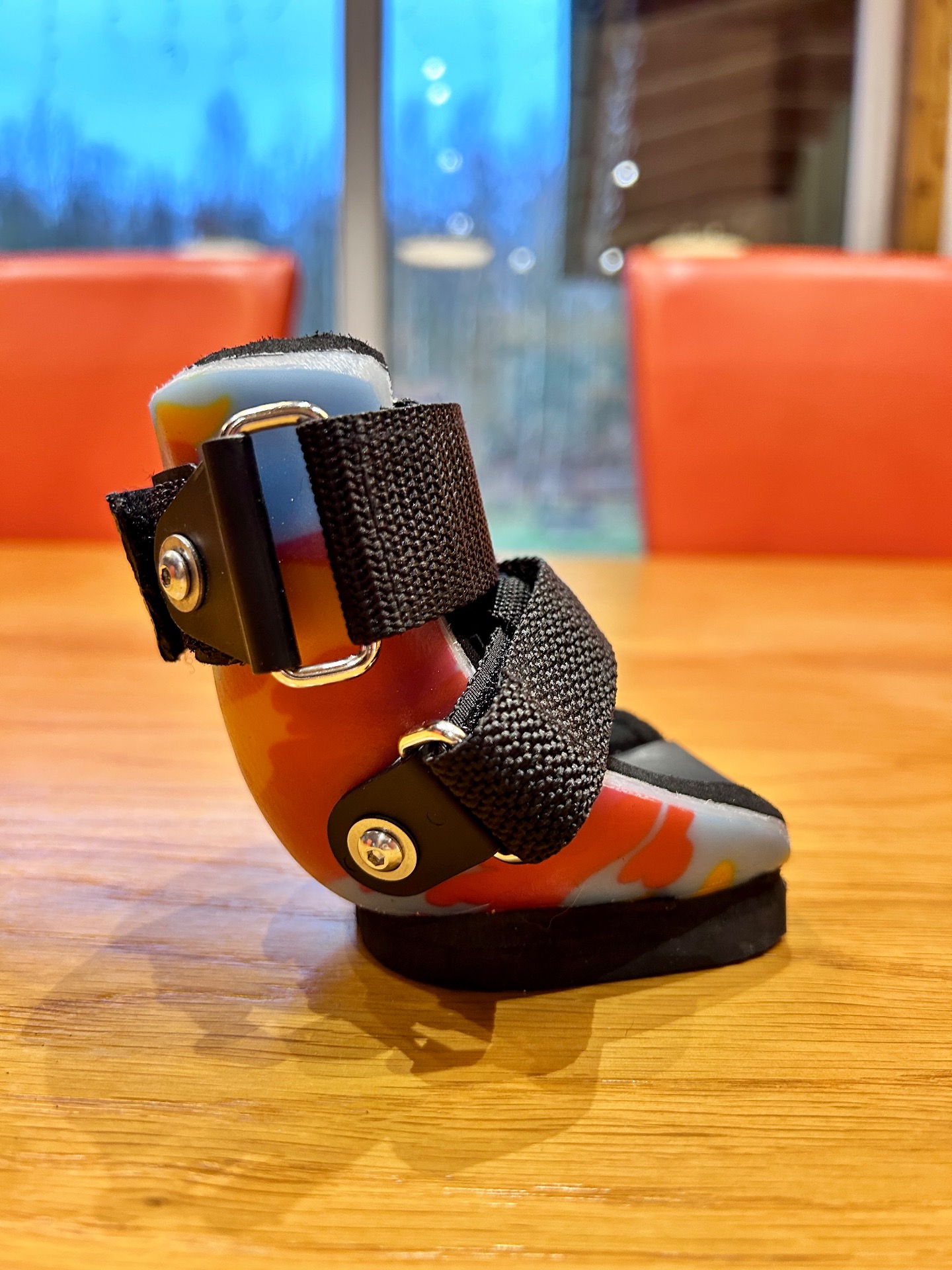 Použité materiály jsou pevné, ale zároveň flexibilní, takže umožňují přirozený pohyb zápěstí (karpu), zatímco spodní část tlapky je chráněna proti tvrdému povrchu, nerovnostem i povětrnostním podmínkám. Botička pomáhá rozložit zátěž při došlapu, zlepšuje stabilitu a zabraňuje dalšímu přetížení oslabených prstů nebo citlivých míst.