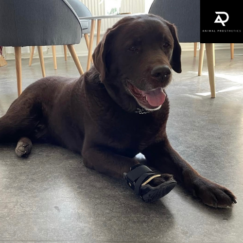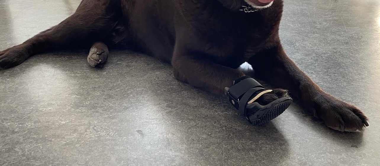 After removal of the main weight-bearing digits, the dog relies on the remaining toes or soft tissue, which leads to quick overloading and risk of injury. A boot: